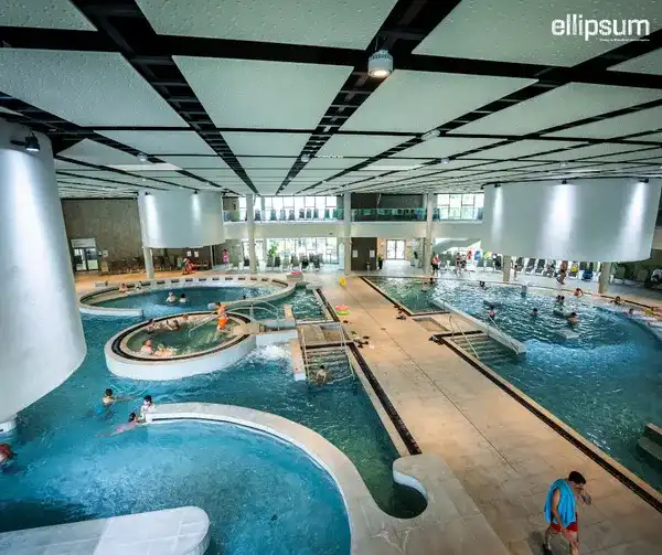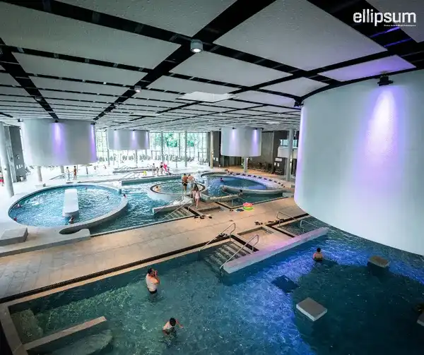 The four-season pool complex consists of 3 halls, designed for all different age groups, including 6 indoor pools, 2 outdoor pools, as well as 3 giant slides along with countless water attractions providing hours of fun, with a total water surface of more than 1,100 sq meters (10,760 sq ft). The elegant, modern and futuristic facility was designed to accommodate 750 guests at full capacity, and it is even equipped with communication systems for the hearing impaired.