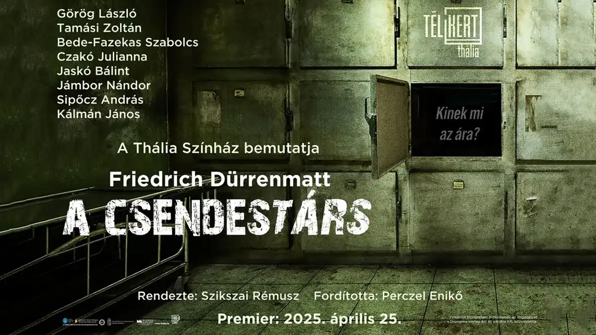 A csendestárs a Thália Télikert sötétebb vonalába illeszkedik. Kinek mi az ára? Tényleg a társadalom a hibás, ha az ember élete tönkremegy? Kié a felelősség? És mire elég az emberi szabad akarat? Komoly kérdések egy öt emelet mély bunkerben, fekete humorral, a hűtőkamra mellett, néhány cseppfolyósított hulla társaságában…