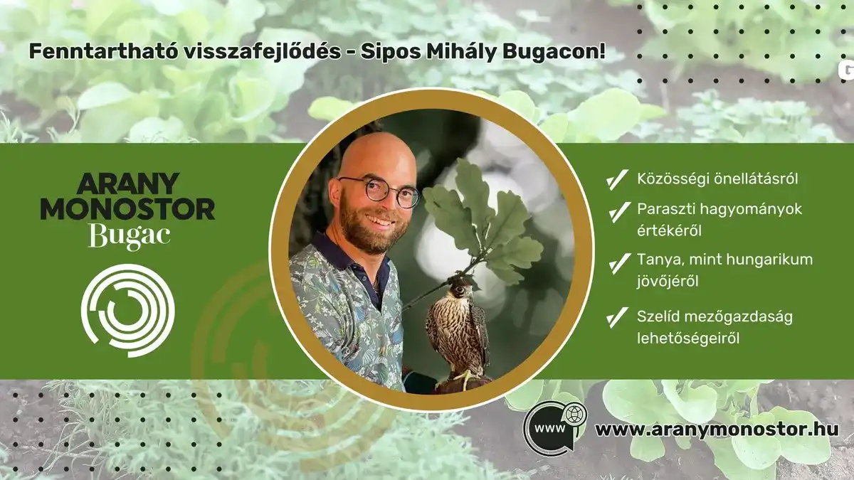 Sipos Mihály okleveles agrármérnök, a Fenntartható Visszafejlődés könyvsorozat írója és Youtube-csatorna alapítója és a több száz tanyasi családot összefogó közösség vezetője tart előadást. Mihály 2010-ben cserélte az egyetemi katedrát gumicsizmára és vasvillára, amikor családjával a Cegléd melletti Tulipános tanyára költözött. Azóta szenvedélyesen dolgozik azon, hogy bemutassa és továbbörökítse a hagyományos paraszti életformát, valamint bátorítsa mindazokat, akik szeretnének kiszabadulni a mókuskerékből és közelebb kerülni a természethez. A szelíd mezőgazdaságot folytatók közösségének vezetője, előadásaiban fókuszban vannak az eltűnőben lévő paraszti hagyományok, a tanya, mint kihalófélben lévő hungarikum.