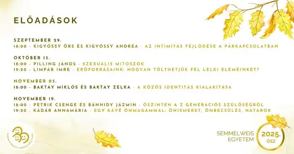 Ősszel folytatódik népszerű előadás-sorozatunk, ahol elismert pszichológusok, párterapeuták és inspiráló személyiségek osztják meg történeteiket, tapasztalataikat és gyakorlati tanácsaikat. Célunk, hogy segítsünk megtalálni és megőrizni a harmóniát – önmagaddal, a pároddal és a körülötted lévő világgal. Várunk szeretettel a Semmelweis Egyetemen!
